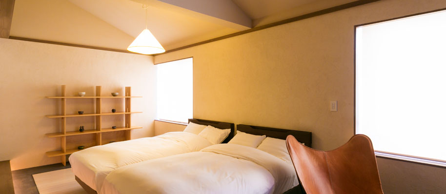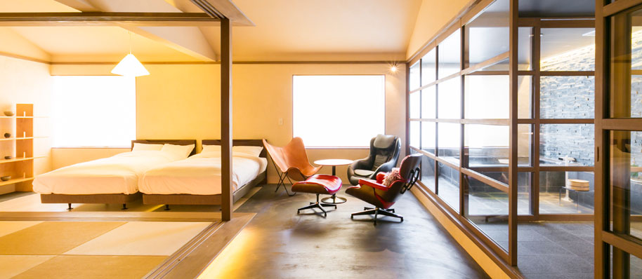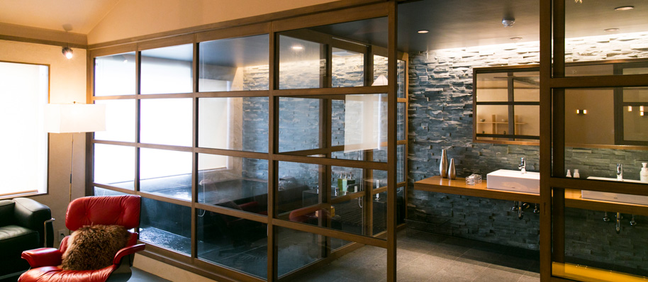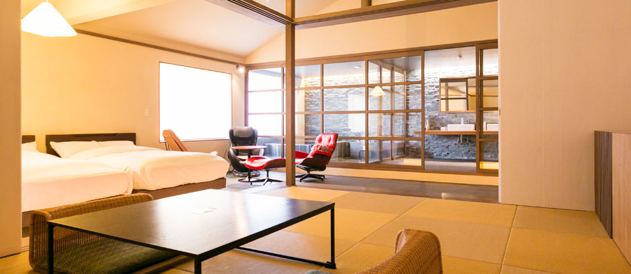 お部屋内に黒御影石のお風呂を設けたロックウォール和洋室です。