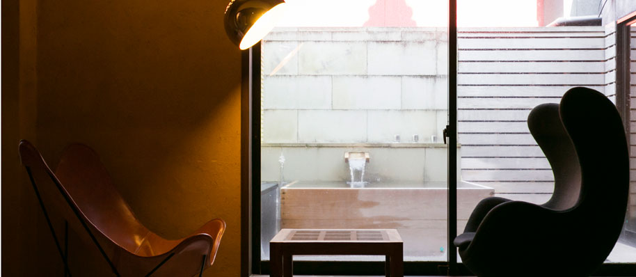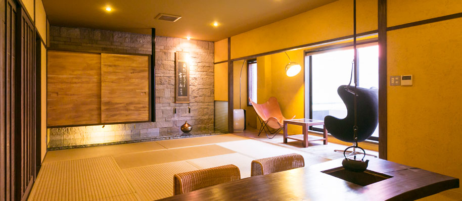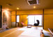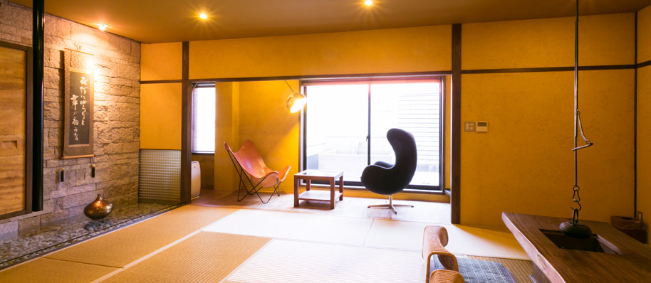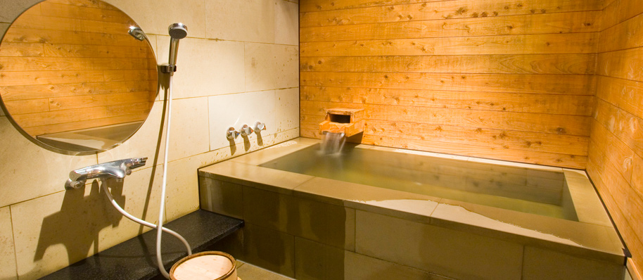 檜の露天風呂と石の内風呂を完備した客室。佐賀県産の肥前名尾和紙、